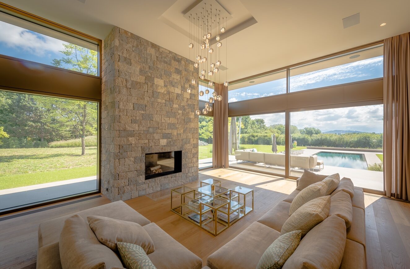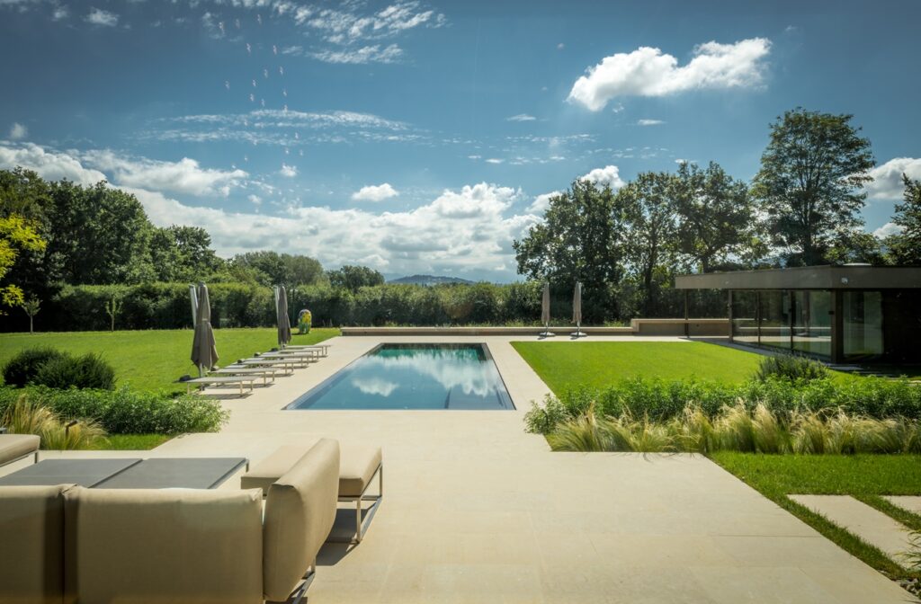 Implantée sur un vaste terrain de plus de 10’000 m², entre zone à bâtir et zone agricole, cette villa individuelle a été pensée pour s’intégrer avec justesse à son environnement. En se positionnant en lisière de la partie constructible, bordée d’une barrière végétale naturelle, la maison s’oriente pleinement vers le paysage, offrant des espaces de vie ouverts sur l’extérieur. L’architecture repose sur un jeu de trois volumes parallélépipédiques qui se glissent les uns par rapport aux autres, structurant les fonctions tout en cadrant des vues précises. L’accès central, aligné avec le salon extérieur et la piscine, guide naturellement le regard vers le Mont-Blanc, fil conducteur discret mais puissant de ce projet.